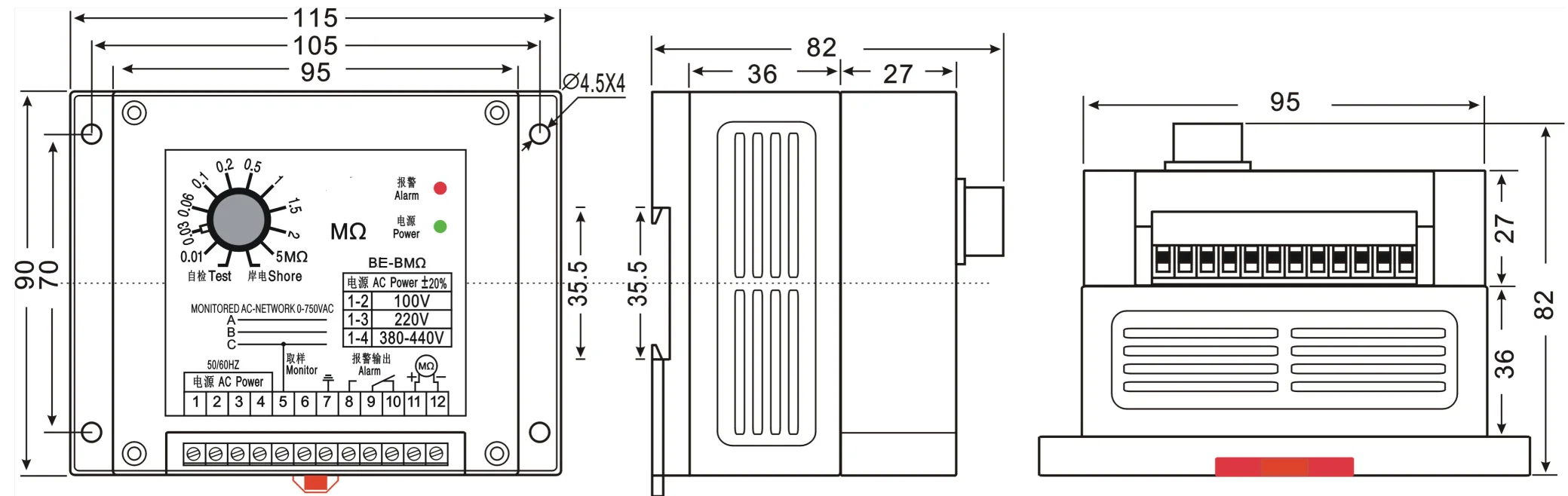 2. According to the need to set the alarm value, and set the red needle to the appropriate file value, when the network insulation resistance is lower than the set value, the instrument will output the alarm signal, then the red signal light. When the insulation resistance returns to normal, the alarm status of the instrument is canceled automatically.